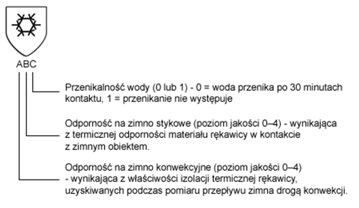 - Przenikalność wody - wymaganie dotyczące odporności na przenikanie wody (0 - woda przenika po 30 min kontaktu lub 1 - przenikanie nie występuje). Należy pamiętać, że rękawice mogą nie zapewniać odpowiedniej izolacyjności cieplnej, jeśli są mokre.